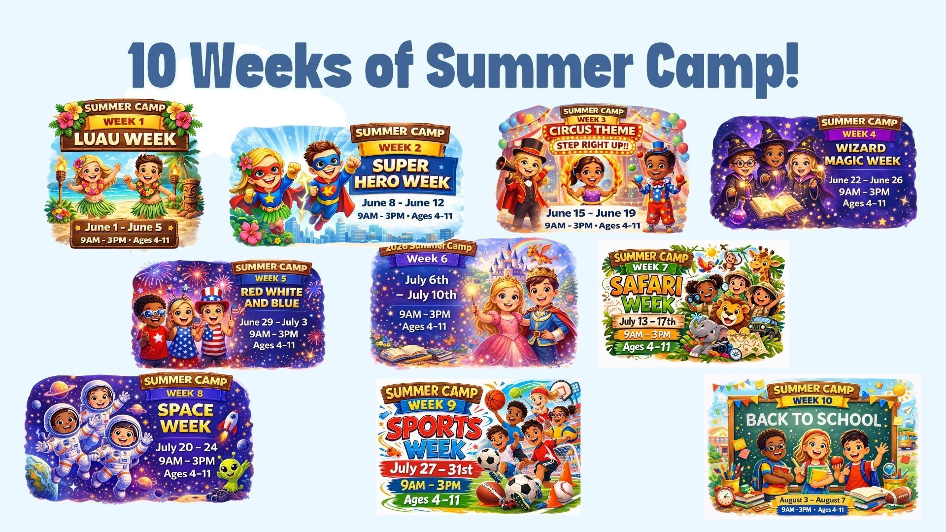 Our camps are for kids ages 4-11 years old. We run camps Monday - Friday from 9 am - 3pm. Every day consist of instructional activities like gymnastics, ninja, crafts, dance, fitness, games, and more.